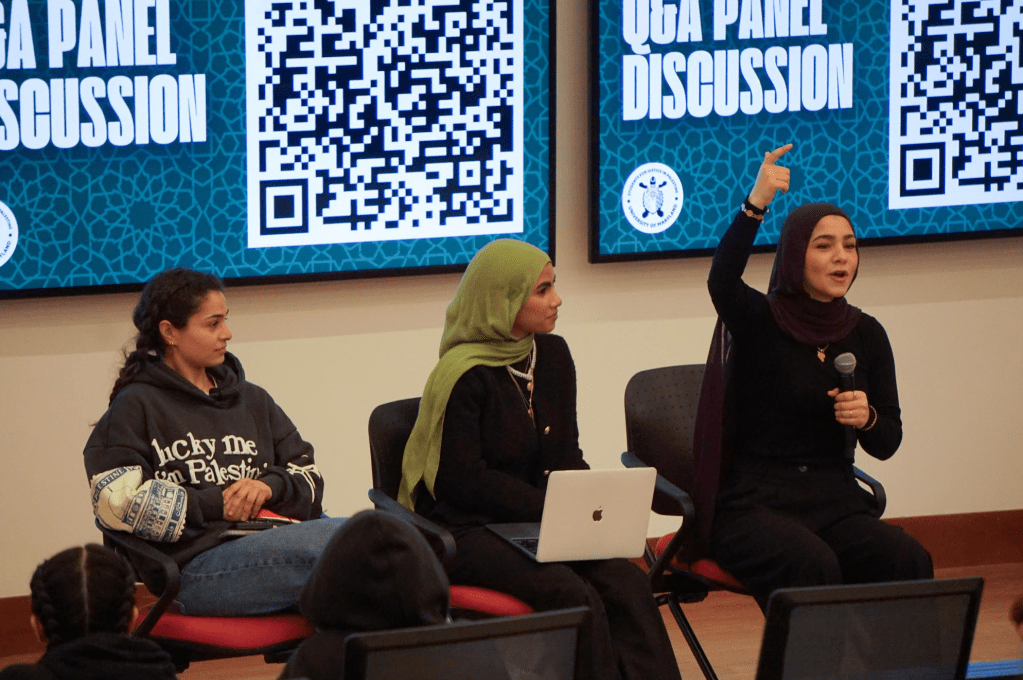 Taimaa HouriZada speaks at the University of Maryland about her experiences in Syria and Palestine at ESJ on Monday, April 7. (Al-Hikmah/Amna Tariq)