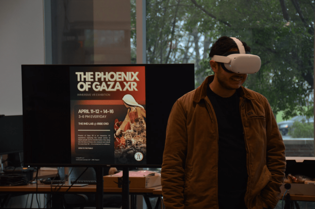 A student participates in the Phoenix of Gaza XR immersive exhibition at the Iribe Center to gain a firsthand perspective of life on the ground. (Al-Hikmah/Safiyah Fatima)