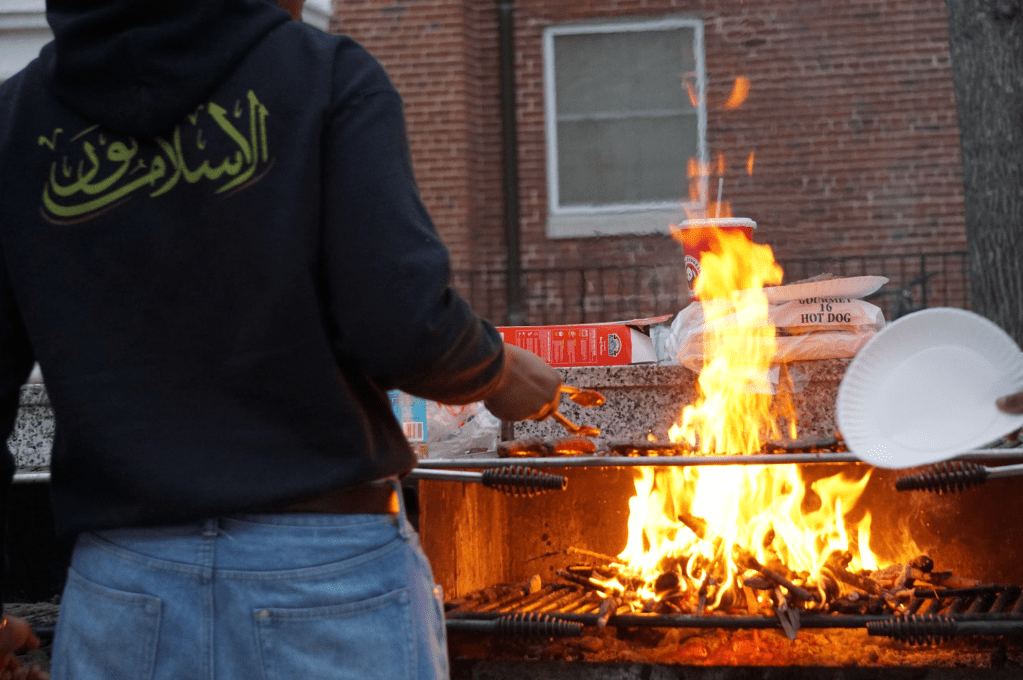 A student cooks patties and sausages on a grill during an Eid barbeque held by Faces of African Muslims (FAM) at Washington Quad on Wednesday, April 2. (Al-Hikmah/Amna Tariq)