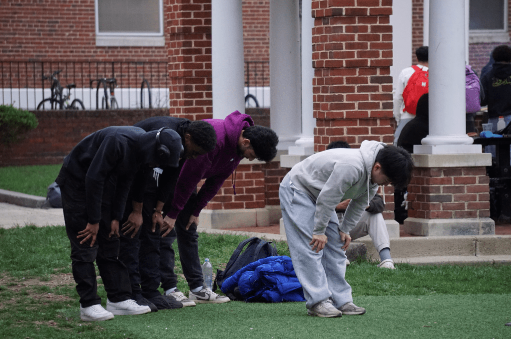 Students pray Asr during the Eid barbeque held by Faces of African Muslims (FAM) at Washington Quad on Wednesday, April 2. (Al-Hikmah/Amna Tariq)