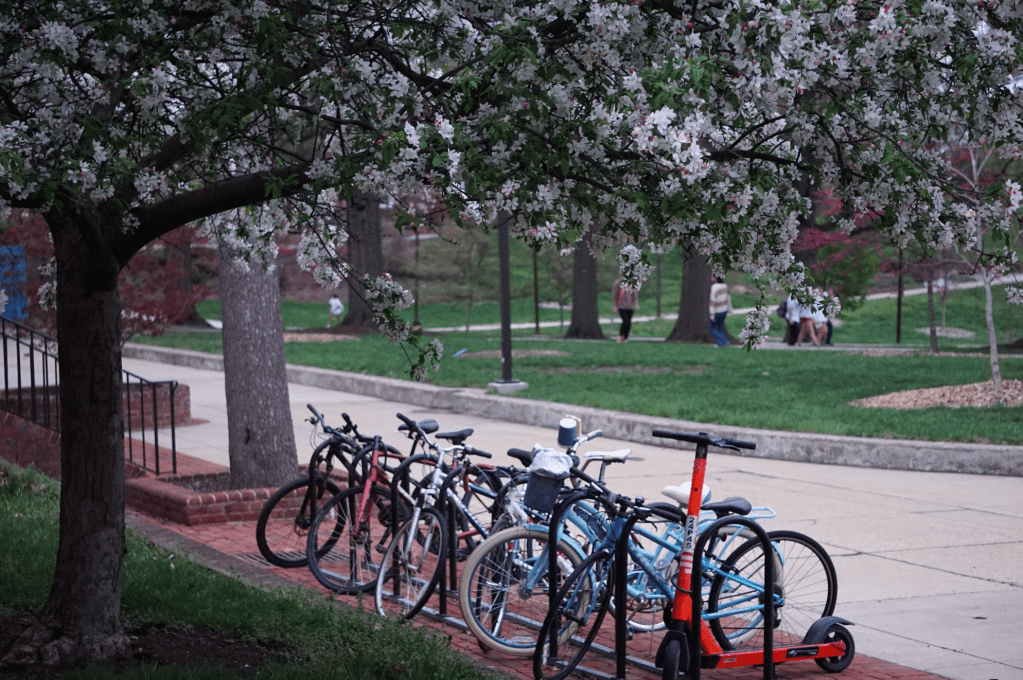 Bicycles sit under a blossomed tree around Washington Quad on Thursday, April 3. (Al-Hikmah/Amna Tariq)