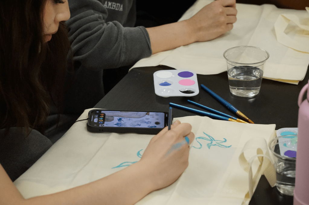 A student paints on a tote bag during Tote-ally Sustainable, a collaboration event between multiple campus Greek organizations, at Cozy Corner in Stamp on Tuesday, April 1. (Al-Hikmah/Amna Tariq)