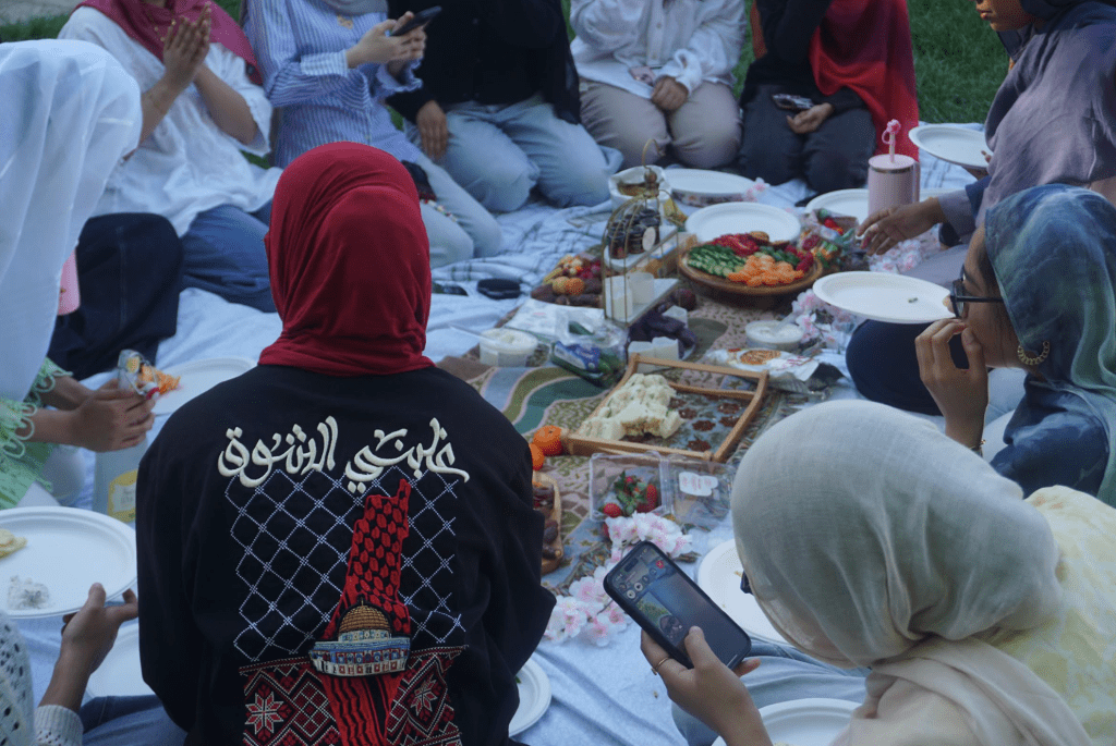 Sisters sit together on a picnic blanket to discuss burnout at the Spring Picnic event held by Muslim Women in Medicine (MWM), in collaboration with Noor on My Mind (NOMM), at Washington Quad on Wednesday, April 23. (Al-Hikmah/Amna Tariq)