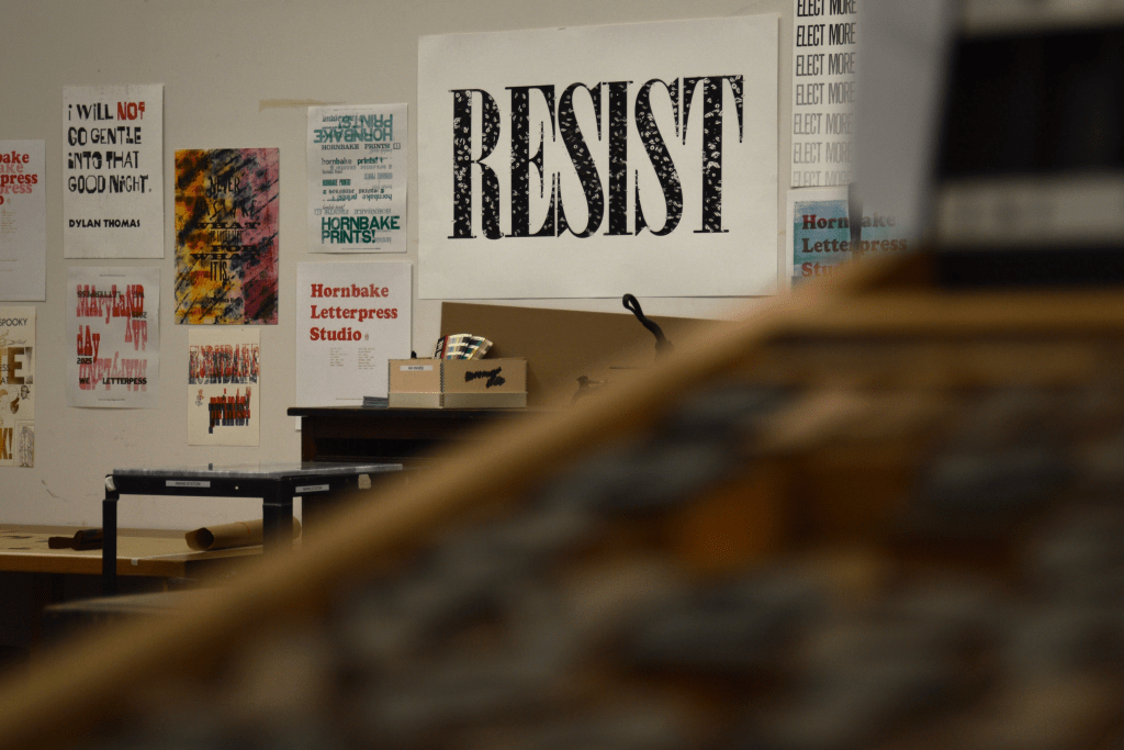 The Hornbake Library Letterpress Studio wall and printing blocks during an event for Maryland Day, Saturday, April 26. (Al-Hikmah/Safiyah Fatima)