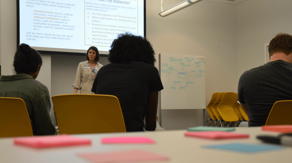 The second part of the workshop was adapted from a lesson in the course ENES200. Students received worksheets to guide them in researching a company of interest—particularly, finding the company’s code of ethics or values statement—and evaluating whether the company’s actions align with their stated principles.