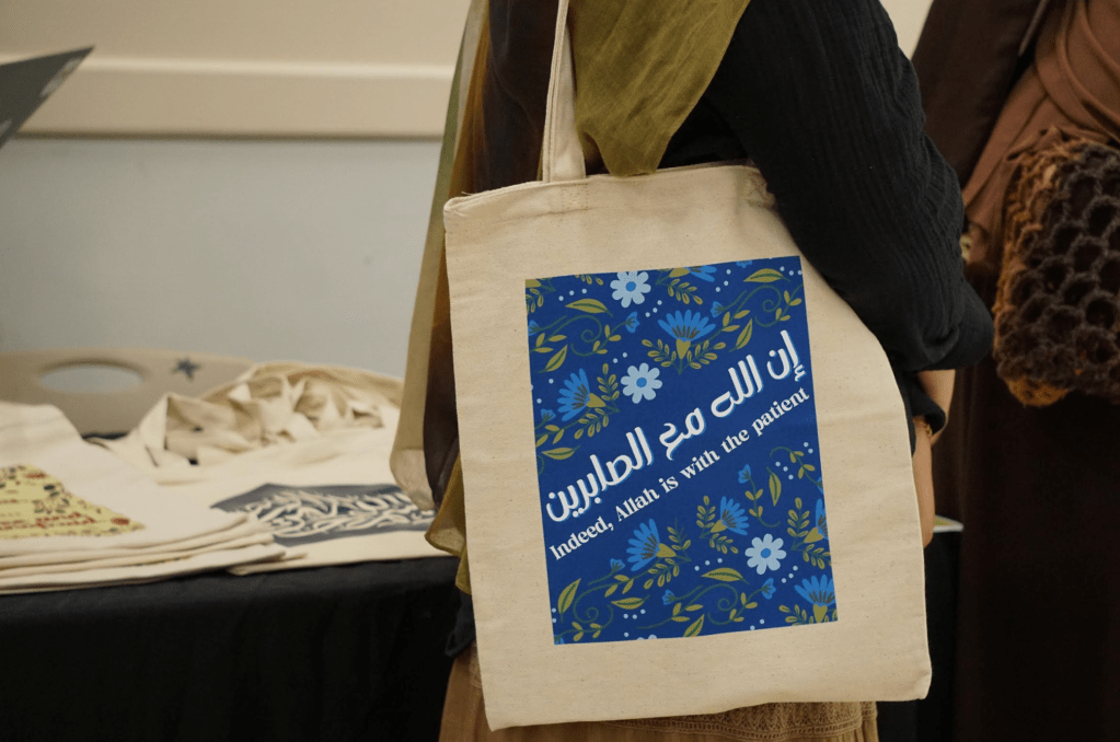 A student wears a tote bag made by a fellow student during the Bazaar held by the Muslim Student Association (MSA) in Nyumburu Basement on Thursday, May 8. (Al-Hikmah/Amna Tariq)
