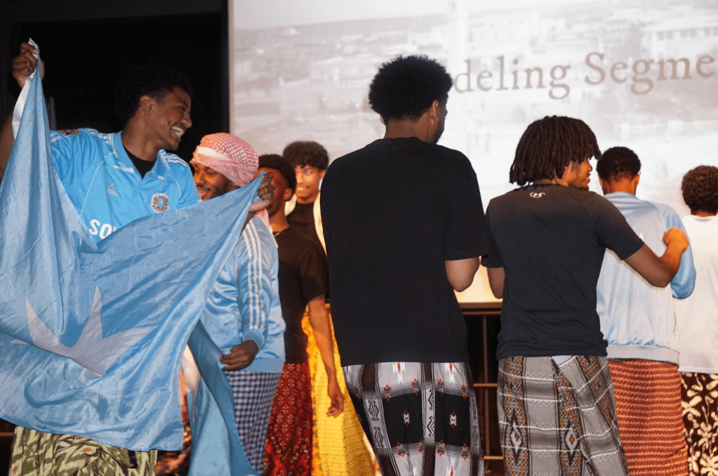 Students dance on stage during the Culture Show held by the Somali Student Association (SSA) in Stamp Colony Ballroom on Saturday, May 10. (Al-Hikmah/Amna Tariq)