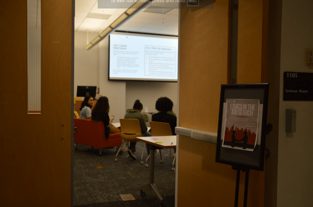 A sign for the Arab American Association of Engineers and Architects (AAAEA) and Egyptian Student Association (ESA) event, “Ethics in the Job Search”, sits outside the workshop on Monday, May 5. (Al-Hikmah/Safiyah Fatima)