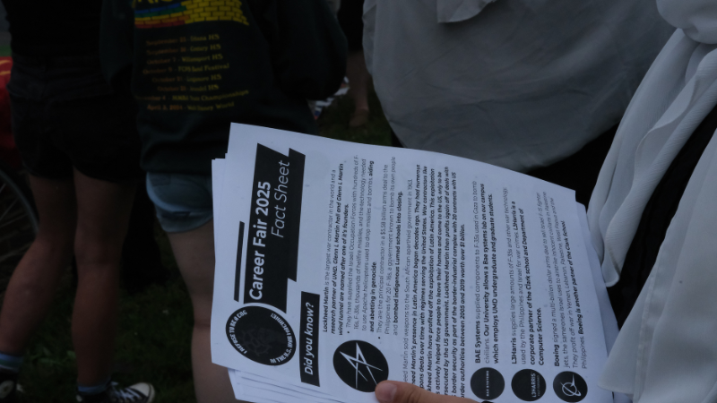 The protest, organized by UMD’s Students for Justice in Palestine (SJP) chapter, was at the Engineering Fields across from The Hotel, where the career fair was held. SJP called for the university to cut ties with “genocide profiteers,” the wrote on socal media. Several protesters entered the fair to distribute pamphlets discouraging participation with some of the companies.