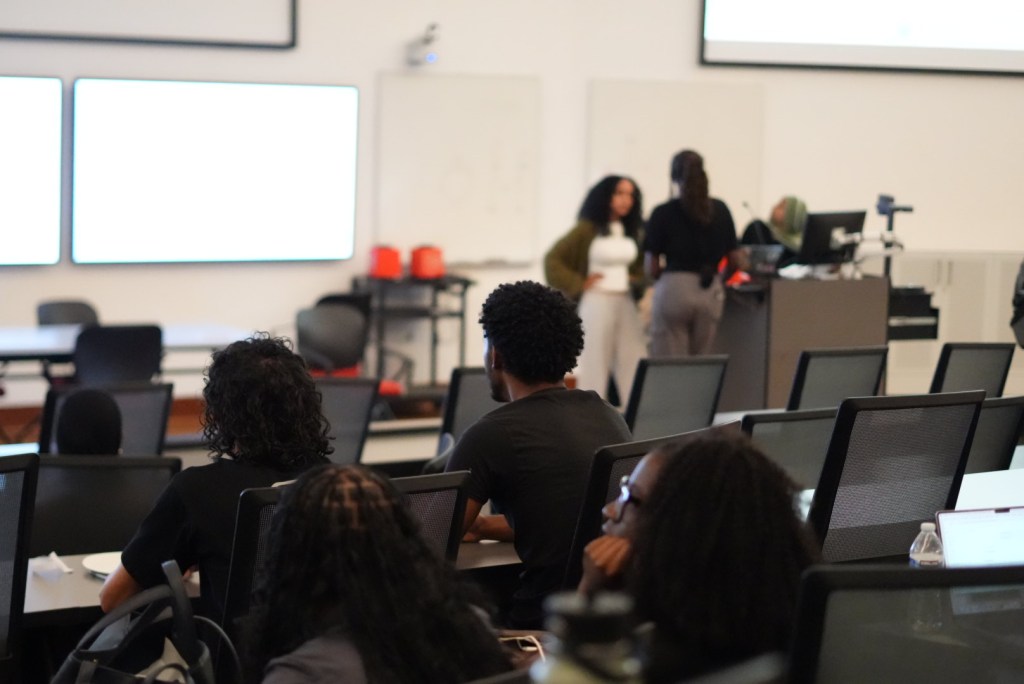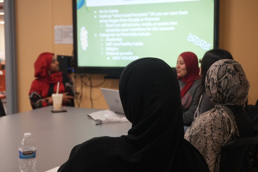 Students listen to founders of Noor On My Mind (NOMM) during their first general body meeting of the semester in Stamp on Thursday, Sept. 25, 2025. (Al-Hikmah/Amna Tariq)