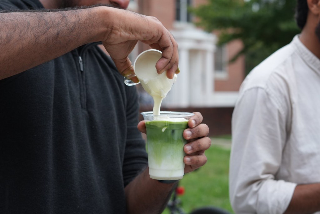 A student from Nawabi Coffee pours cold foam over an iced tiramisu matcha latte at Washington Quad on Wednesday, Sept. 24, 2025. (Al-Hikmah/Amna Tariq)