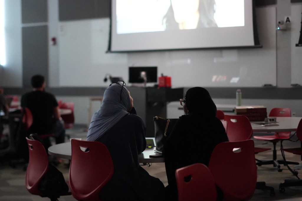 Two students sit in a classroom in ESJ to watch the movie “Omar” at a movie night held by the Palestinian Culture Club (PCC) on Thursday, Sept. 25, 2025. (Al-Hikmah/Amna Tariq)