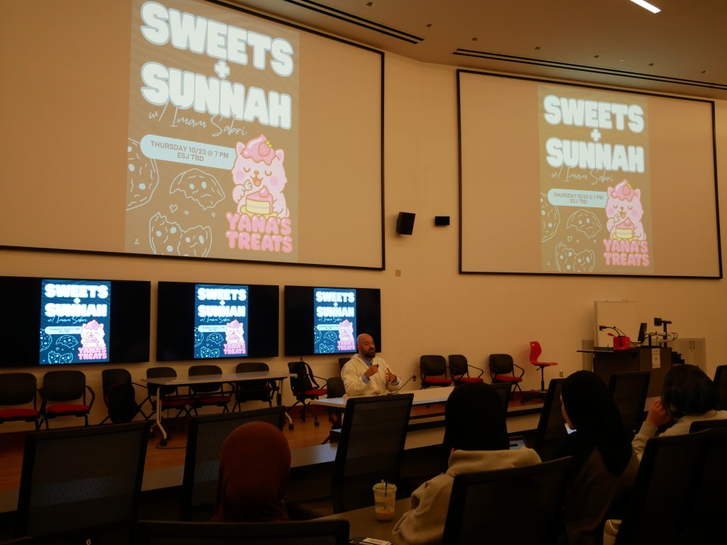 One event held during charity week was “Sweets and Sunnah,” at the Edward St. John Learning and Teaching Center on Thursday, Oct. 23. The event featured a halaqa led by Imam Sabri BenKahla, from the Dar-us-Salaam mosque in College Park, Maryland, who spoke about the signs of sickness in the heart in Islam.