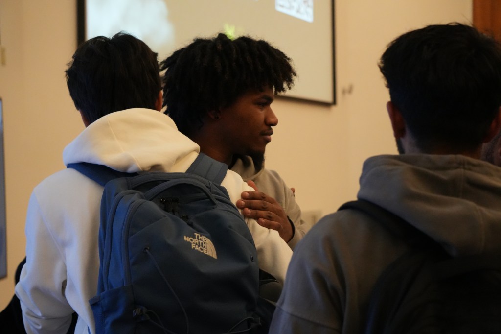 A student who converts to Islam is embraced by a fellow student after a halaqah in ESJ, hosted by The Link tour in collaboration with the Muslim Student Association (MSA) on Tuesday, Oct. 28, 2025. (Al-Hikmah/Amna Tariq)