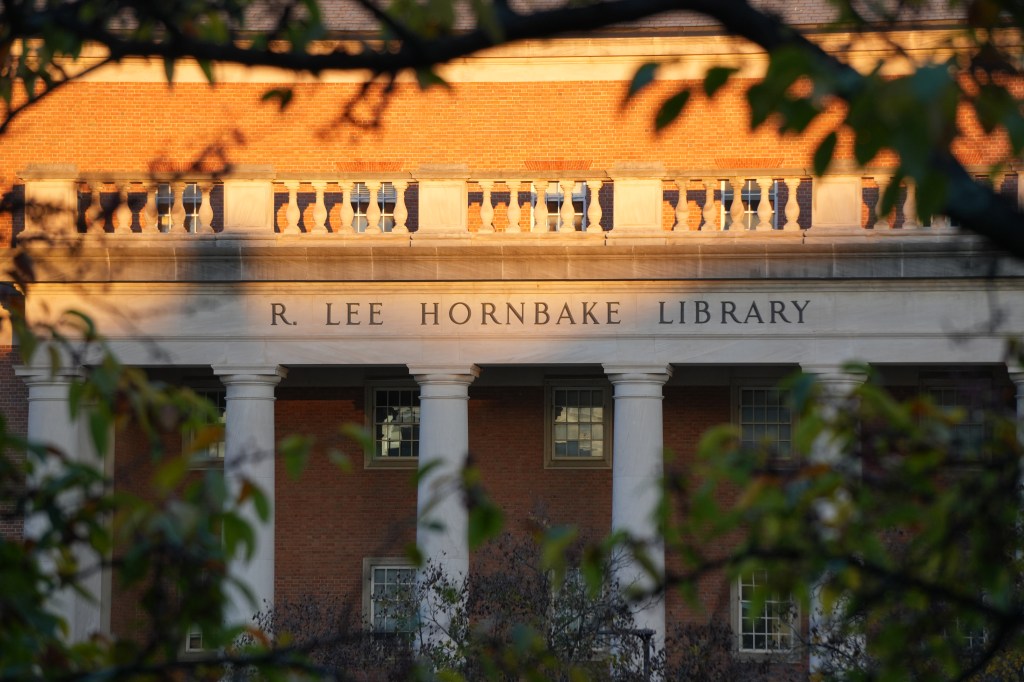 The sun shines on the front of Hornbake Library during sunset on Thursday, Oct. 30, 2025. (Al-Hikmah/Amna Tariq)