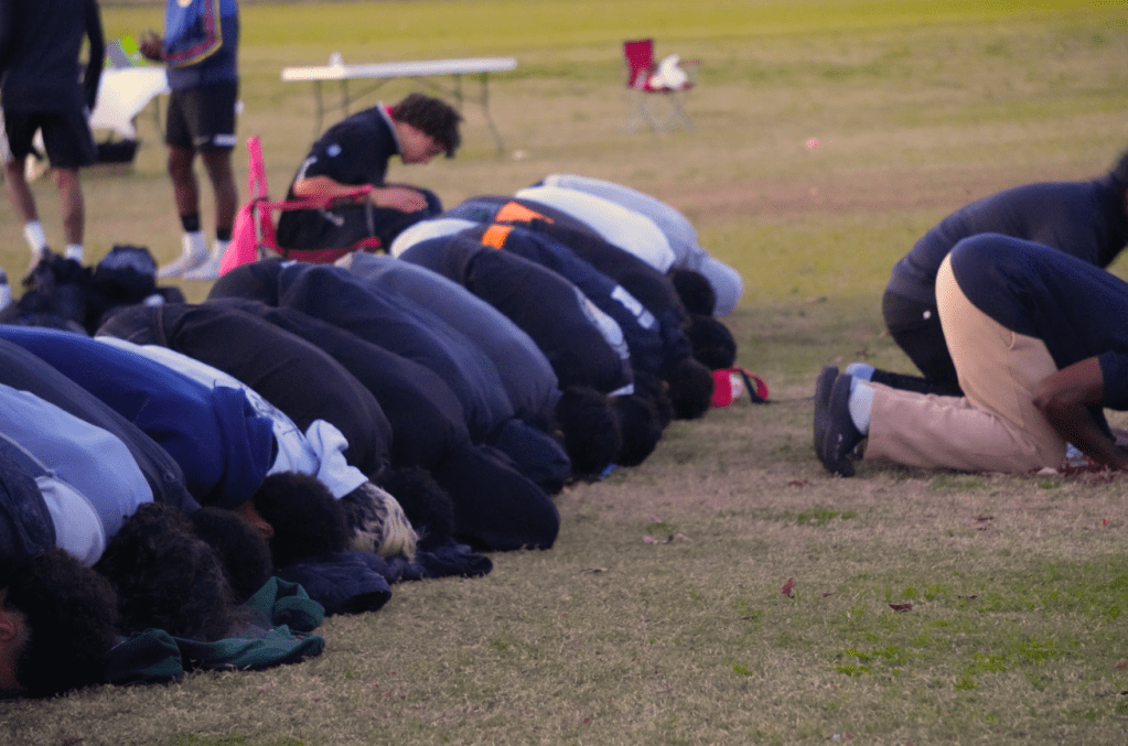 Students join together to pray maghrib during the AFCON Tournament held by Al-Maghreb United at Engineering Multipurpose Fields on Sunday, Nov. 23, 2025. (Al-Hikmah/Amna Tariq)