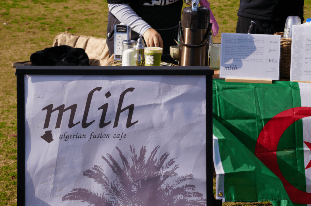 A sign for MLIH Cafe stands by a table during the AFCON Tournament held by Al-Maghreb United at Engineering Multipurpose Fields on Sunday, Nov. 23, 2025. (Al-Hikmah/Amna Tariq)