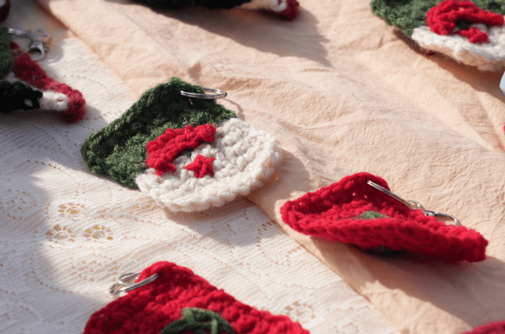 Crocheted flags of Algeria and Morocco, made by Stardust Stitchez, lay on a table during the AFCON Tournament held by Al-Maghreb United at Engineering Multipurpose Fields on Sunday, Nov. 23, 2025. (Al-Hikmah/Amna Tariq)