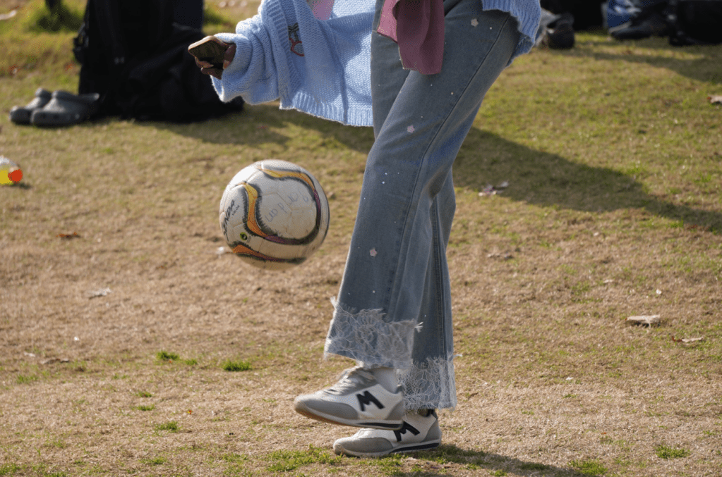 A student kicks up a soccer ball as she watches the AFCON Tournament held by Al-Maghreb United at Engineering Multipurpose Fields on Sunday, Nov. 23, 2025. (Al-Hikmah/Amna Tariq)