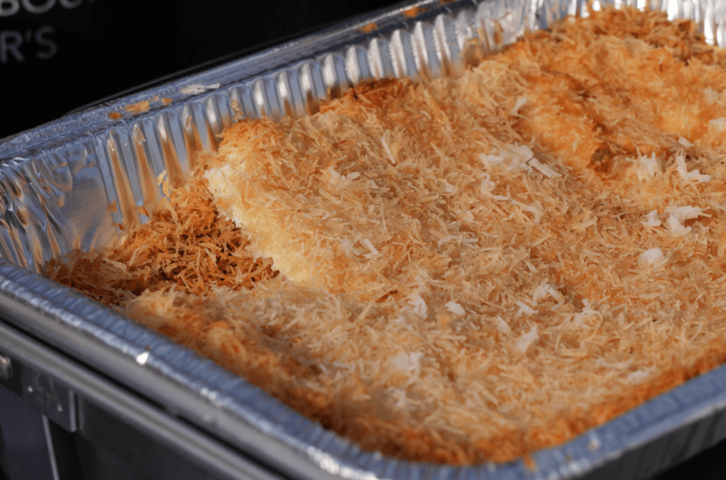 Warm knafeh, made by small business Oh My Kunafah, sits outside at a table during the AFCON Tournament held by Al-Maghreb United at Engineering Multipurpose Fields on Sunday, Nov. 23, 2025. (Al-Hikmah/Amna Tariq)