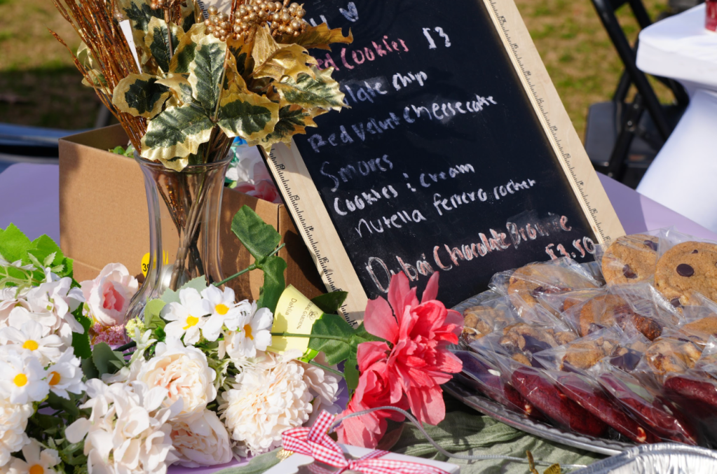 Flowers decorate a table selling cookies and brownies, made by Baked by Sobia, at the AFCON Tournament held by Al-Maghreb United at Engineering Multipurpose Fields on Sunday, Nov. 23, 2025. (Al-Hikmah/Amna Tariq)