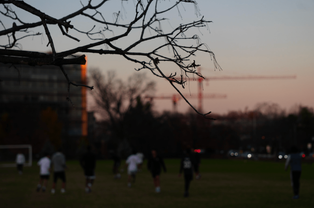 The sun sets over the Engineering Multipurpose Fields during the AFCON Tournament held by Al-Maghreb United on Sunday, Nov. 23, 2025. (Al-Hikmah/Amna Tariq)
