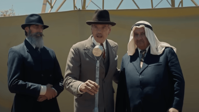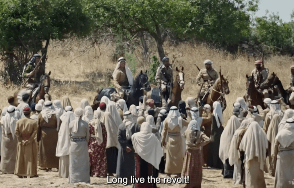 In the same scene, the British discuss the purpose of the radio service about to be launched, and blend blunt racism with trite attempts at wrapping it in subtlety. The High Commissioner Arthur Wauchope (Jeremy Irons) immediately says on this radio, “…[will] not be concerned with politics…” but not soon after says he hopes it will be used to “…explain [to countryside farmers] the advantages of various kinds of means of cooperation.” As is shown later in the movie, the revolution in question had a strong countryside presence as the British refused to support the villagers, who complained of settlers literally setting fire to their crops. Perhaps the most poignant symbol from this entire scene however, is when the radio officially launches. In a display of unity, a settler representative speaking in Hebrew, a Palestinian representative speaking in Arabic, and the Commissioner himself speaking in English, all say the first lines into the broadcast. On the surface, a beautiful gesture, demonstrating the genuine hope for goodwill and reconciliation the British colonizers hope to create between the settler Jews and Palestinians. Yet, they say their lines in a certain order: The Commissioner goes first, then the settler, then the native Palestinian. The colonizer first, his patron second, and the native they both take land from last. Even when the colonizer thinks they are being merciful and just, in the cultural logic of this practice is an innate, unconscious disrespect for the people colonized.
